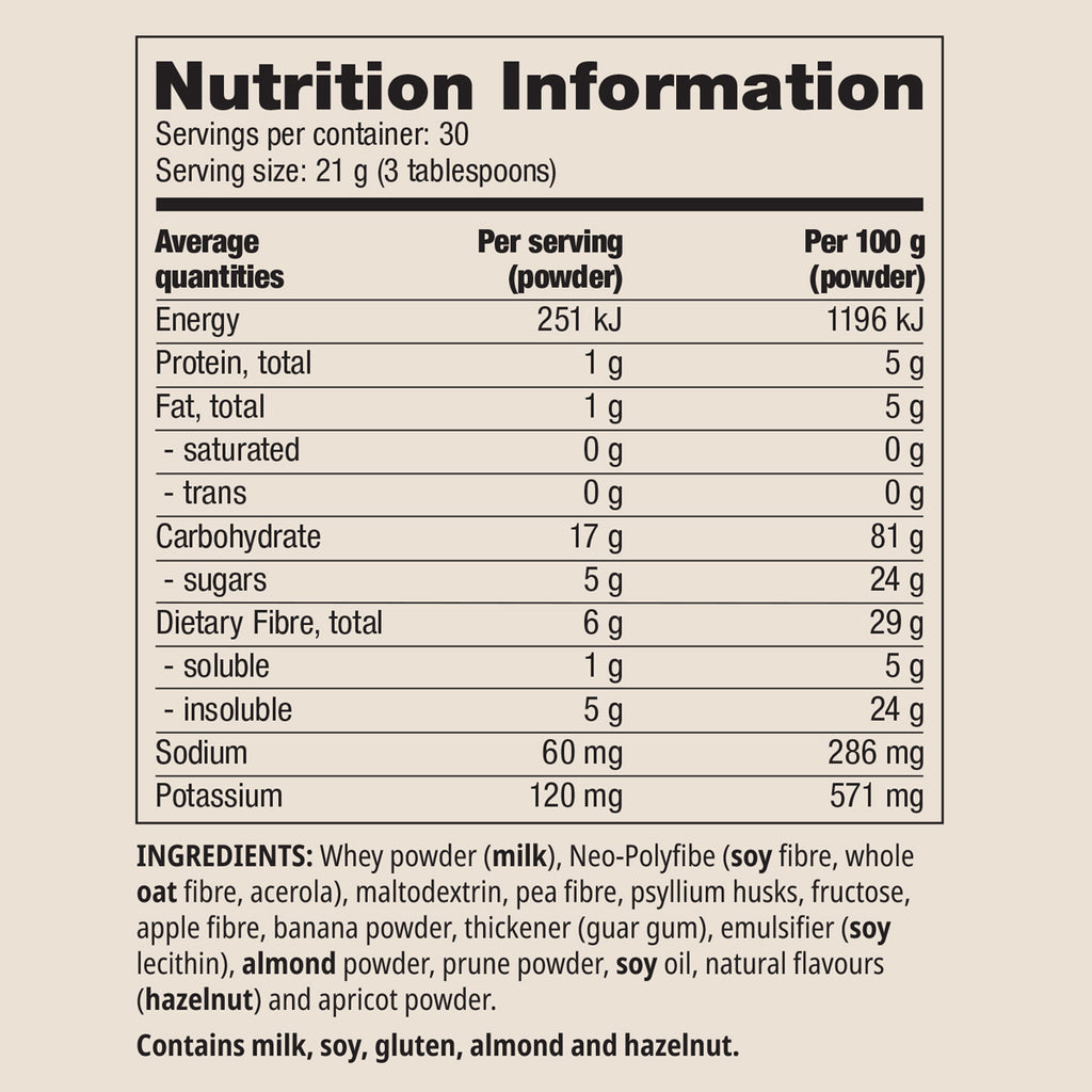 - 12 natural sources provides 6g of fibre per serving – 5g insoluble and 1g soluble